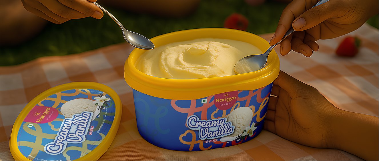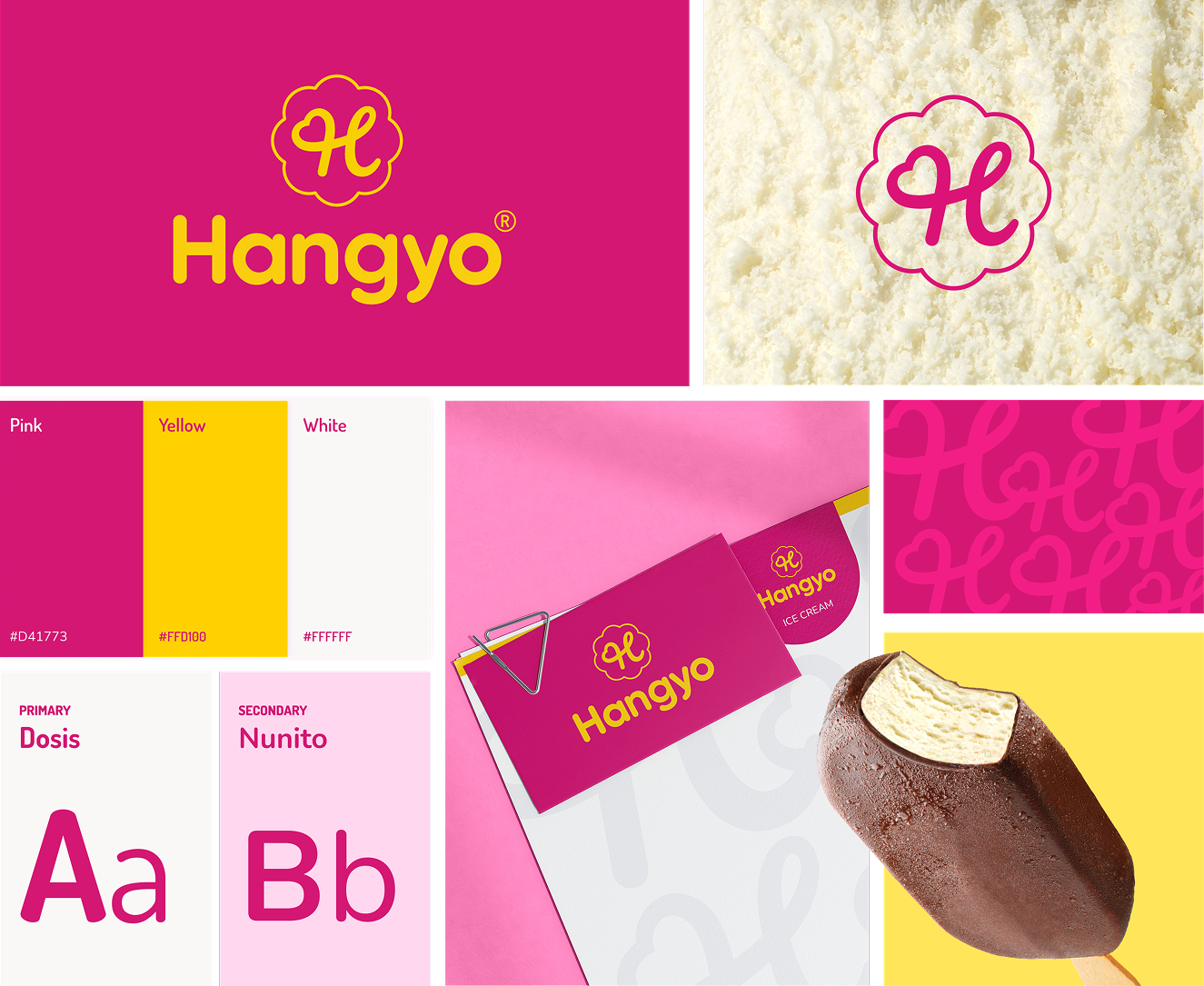 This system mixes vivid magenta with warm yellow for an instant burst of energy. The rounded typography and the Symbol of Happiness “H” add a soft, nostalgic ice-cream feel to the brand.