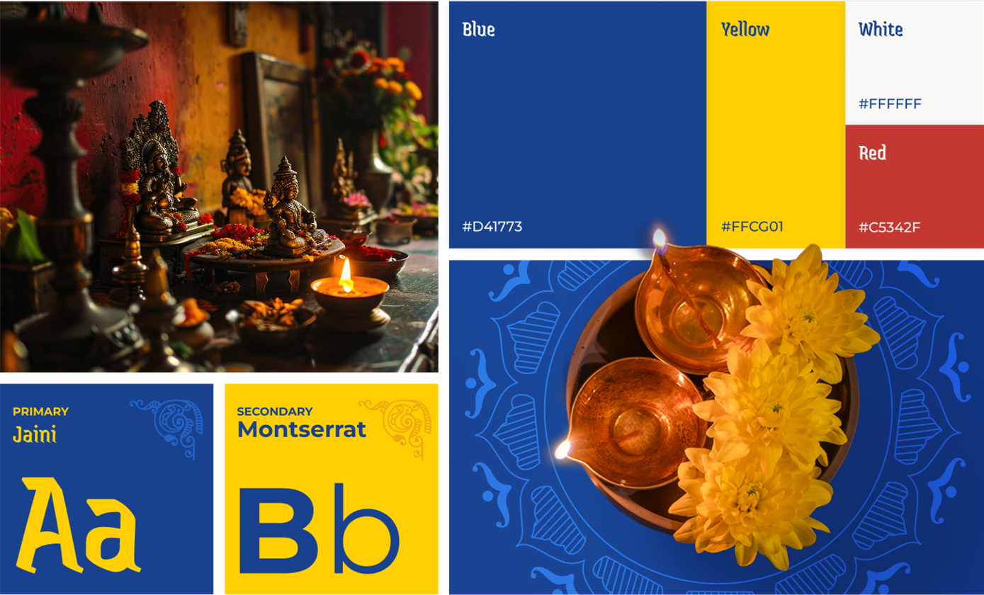 The bold forms echo temple motifs and sacred patterns, giving the brand a strong visual pulse across packaging, print, and digital. They anchor the system and make the identity feel alive wherever it appears.