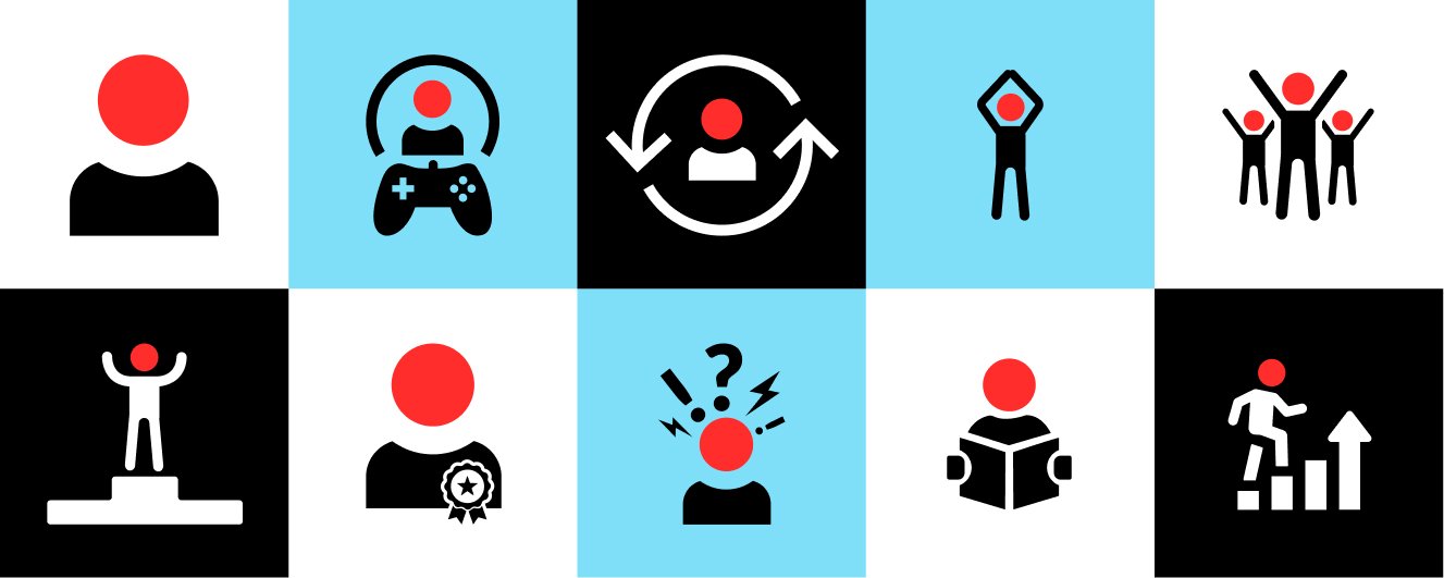 The iconography centers on the individual, reflecting the core unit of every gamified system. Each icon represents key behavioral moments such as participation, achievement, recognition, learning, and growth. Built using consistent geometry and visual balance, the set creates a clear, intuitive layer that reinforces progression, feedback, and accomplishment across every brand and product interaction.